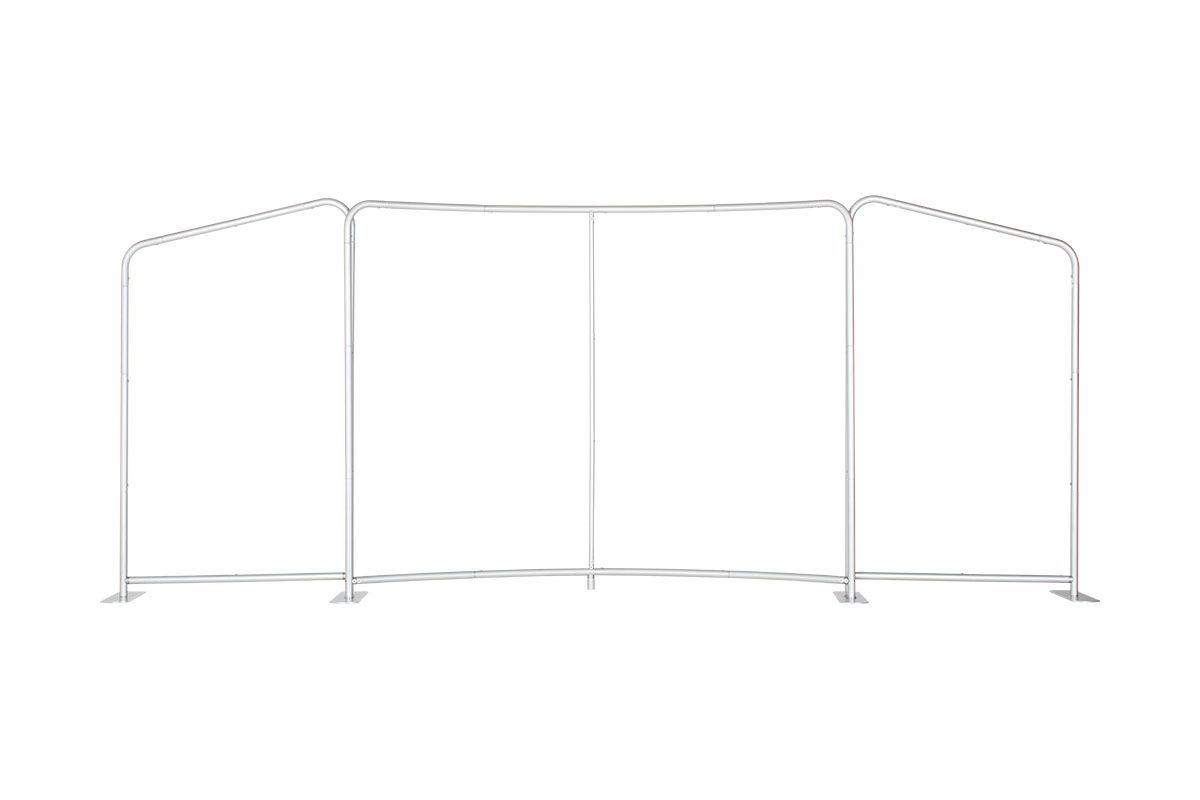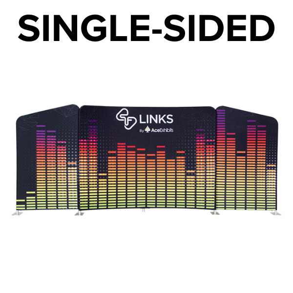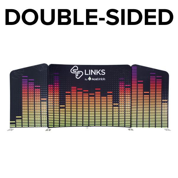 The Tru-Fit 3.0 - Links Package 2010-7 combines three distinct panels into one unified modular display, creating a dynamic 20ft-wide setup ideal for trade shows, corporate events, galas, and branded activations. The layout includes one concave Module N trade show backdrop at the center, flanked by two angled Module F frames—each built with upgraded aluminum tubing and oversized push pins for quick, secure assembly. The frames connect via interchangeable footplates and cotter pins, giving you the flexibility to use the units as a group or as stand-alone displays. Each custom fabric banner is dye-sublimated onto stretch material for rich, high-resolution graphics that resist fading and are machine washable. The pillowcase-style covers slide over the frame and zip at the base, creating a clean, professional finish across all three modules. Optional lighting clips easily to the top of each tension fabric display, helping your message stand out in high-traffic areas. A two-person team can assemble the full trade show display in just minutes. For easy transport, choose from three durable cases: the lightweight wheeled suitcase, a hard-sided Premium Carry All Case, or the molded plastic Transport Case. All options simplify travel and storage, though due to size and weight, be sure to confirm airline baggage restrictions before flying.
